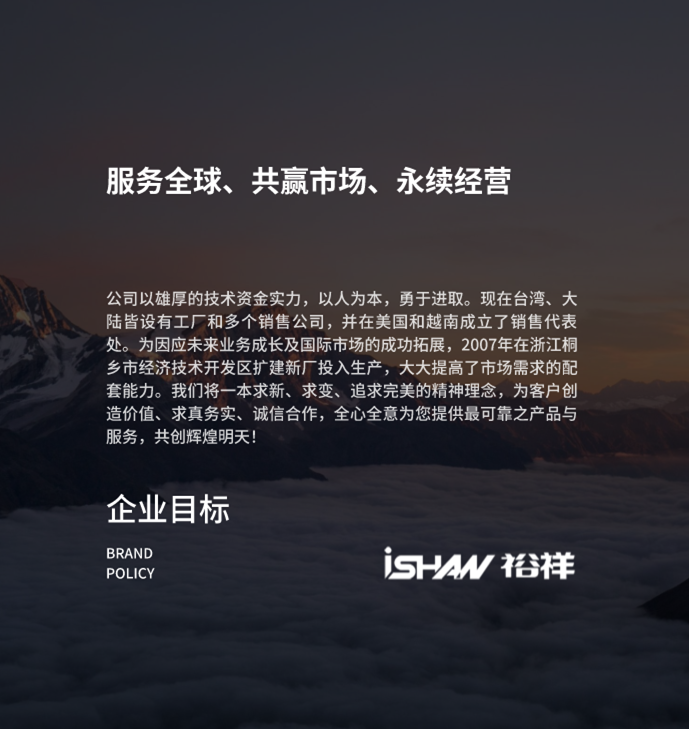 公司以雄厚的技術(shù)資金實(shí)力,以人為本,勇于進(jìn)取。現(xiàn)在臺(tái)灣、大陸皆設(shè)有工廠和多個(gè)銷售公司,并在美國和越南成立了銷售代表處。為因應(yīng)未來業(yè)務(wù)成長及國際市場(chǎng)的成功拓展,2007年在浙江桐鄉(xiāng)市經(jīng)濟(jì)技術(shù)開發(fā)區(qū)擴(kuò)建新廠投入生產(chǎn),大大提高了市場(chǎng)需求的配套能力。我們將一本求新、求變、追求完美的精神理念,為客戶創(chuàng)造價(jià)值、求真務(wù)實(shí)、誠信合作,全心全意為您提供最可靠之產(chǎn)品與服務(wù),共創(chuàng)輝煌明天!
